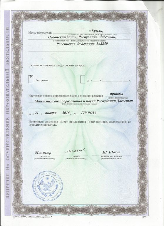 Адрес местонахождения образовательной организации* 368859 Республика Дагестан, Ногайский район с.Кумли